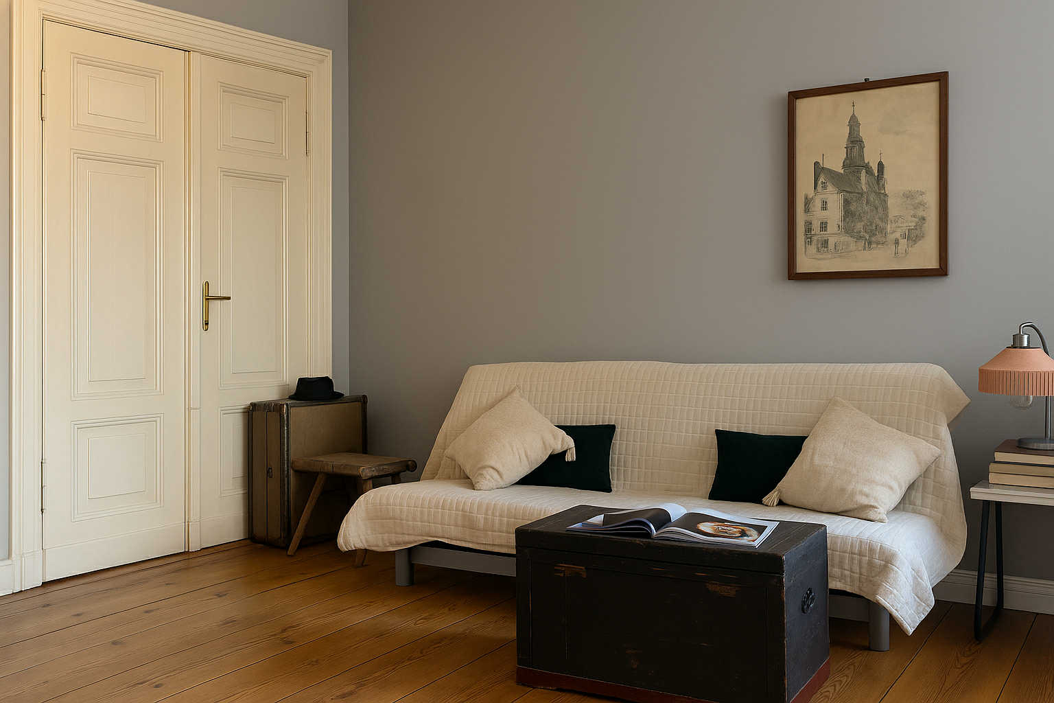 🛋 Salon z aneksem kuchennym – przestronny i jasny, z widokiem na ciche, zielone podwórze wewnętrzne kamienicy
